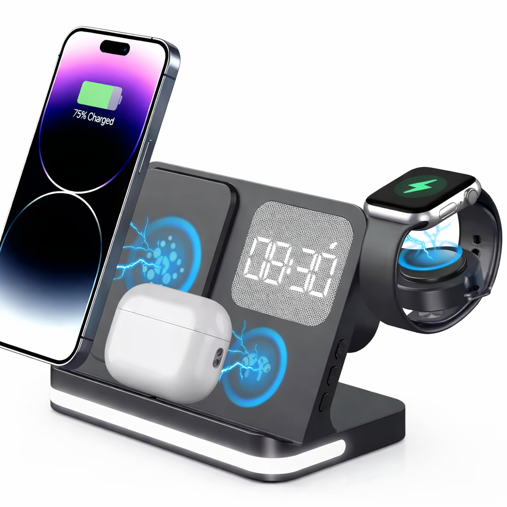 Charge your phone, earbuds, and smartwatch with this sleek 6-in-1 wireless charging station. Featuring a built-in clock display, ambient light, and a foldable design, it keeps your desk clean while powering your essential devices.